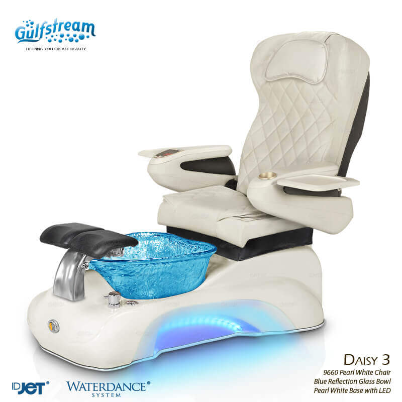 Introducing the Daisy 3 Deluxe Pedicure Chair. Relax in this sleek new slimline base with an illuminated led light which hugs the contours of this unit. Our versatile classic footrest is again used for a comfortable experience for both technician and client. Ampro offers Gulfstream’s signature hand crafted glass bowl, available in an assortment of vibrant colors, durable acrylic base, high quality massage chair and IDJet Technology.