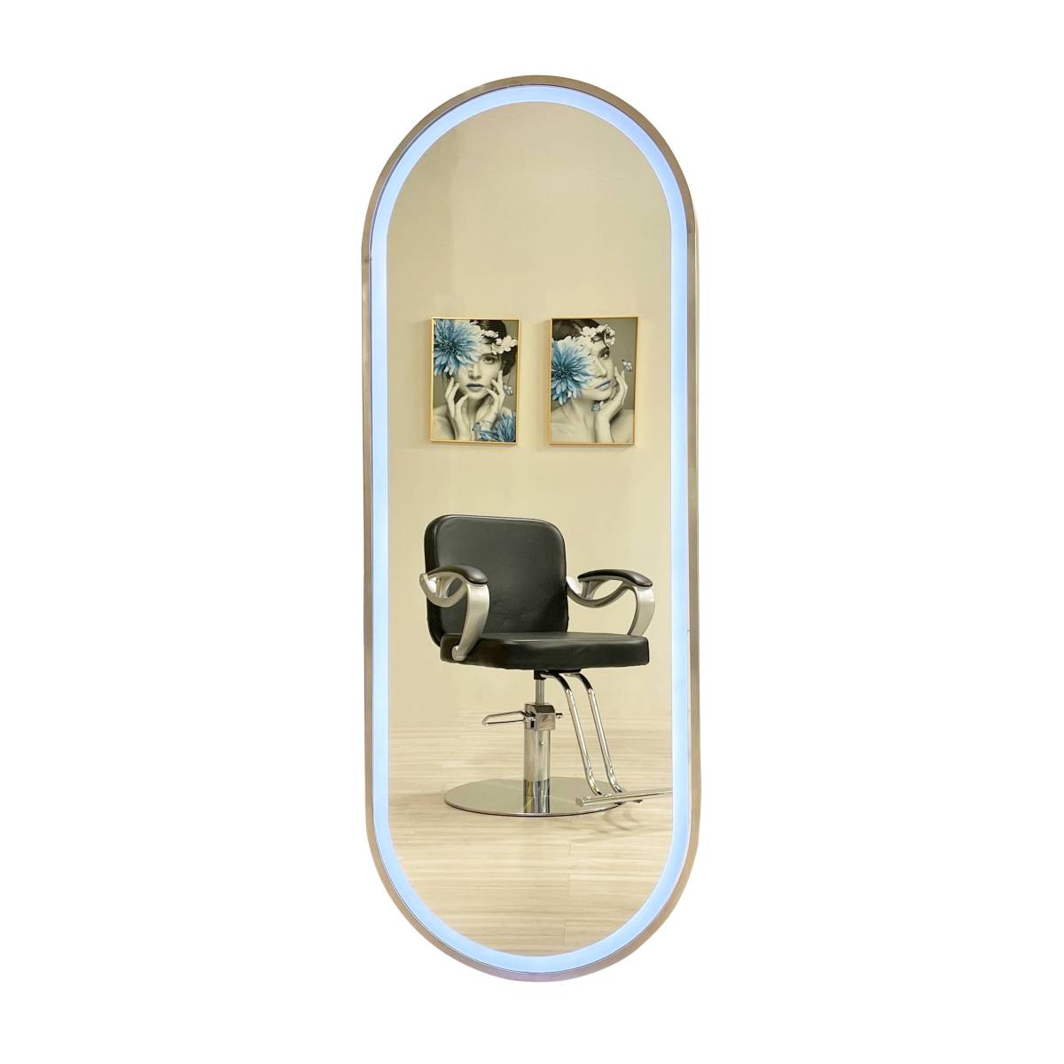 Create the perfect ambient setting for your salon staff and clients by illuminating your hair salon, spa, barbershop or vanity with the Griffin Wall_Mount LED Mirror (Gold) from Golden Devon (B-095). Gold frame & oval shape. Designed electrical ready and wired for a standard outlet, simply plug in the mirror, and touch the power switch button to turn on/off LED lighting.