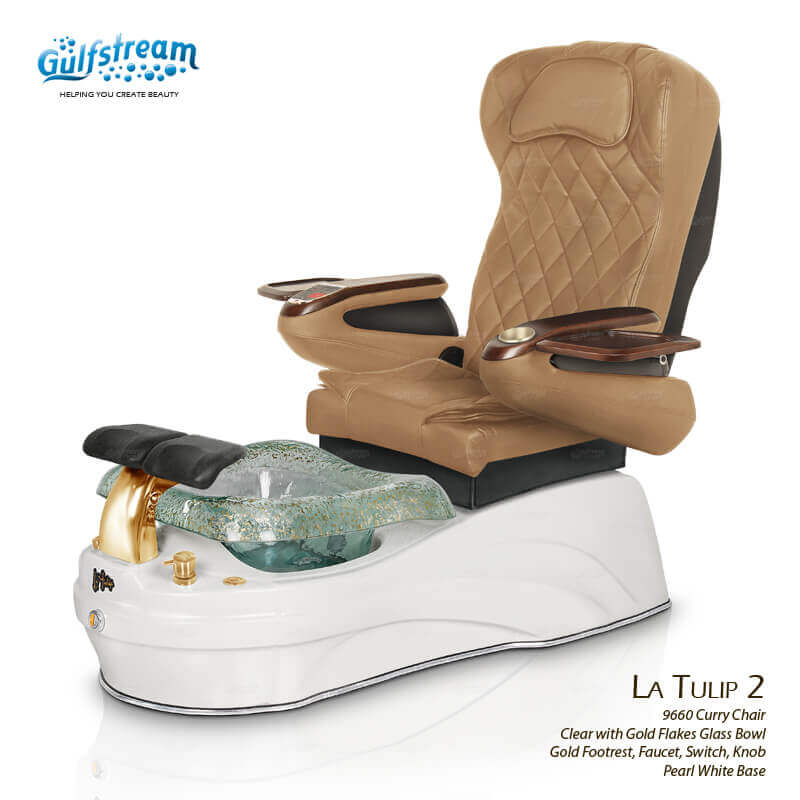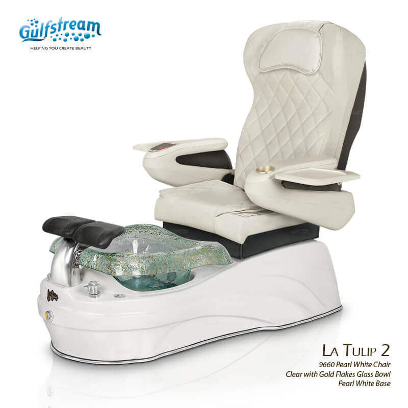 Introducing the La Tulip 2 Deluxe Pedicure Chair. Relax in this sleek new slimline base with an illuminated led light which hugs the contours of this unit. Our versatile classic footrest is again used for a comfortable experience for both technician and client. La Tulip offers Gulfstream’s signature hand crafted glass bowl, available in an assortment of vibrant colors, durable acrylic base, high quality massage chair and IDJet Technology.