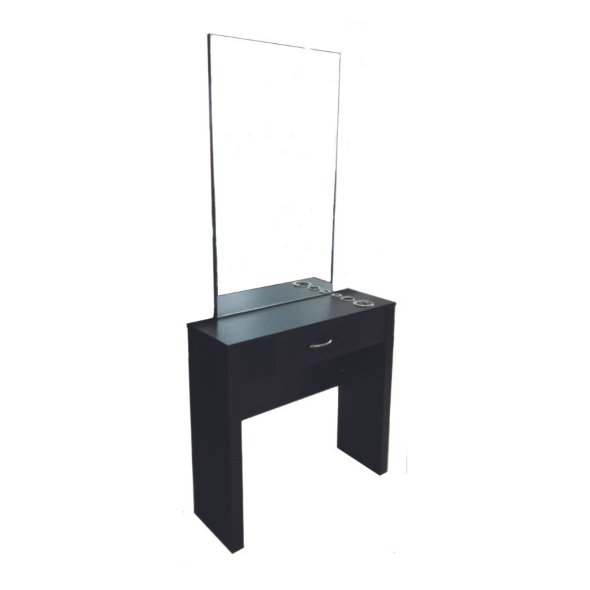 The Sasha styling station is perfect for various types of salons. Its ultra sleek frameless mirror and black laminate creates a contemporary design. Has pull out drawer for storage + 3 chrome inserts for tools.