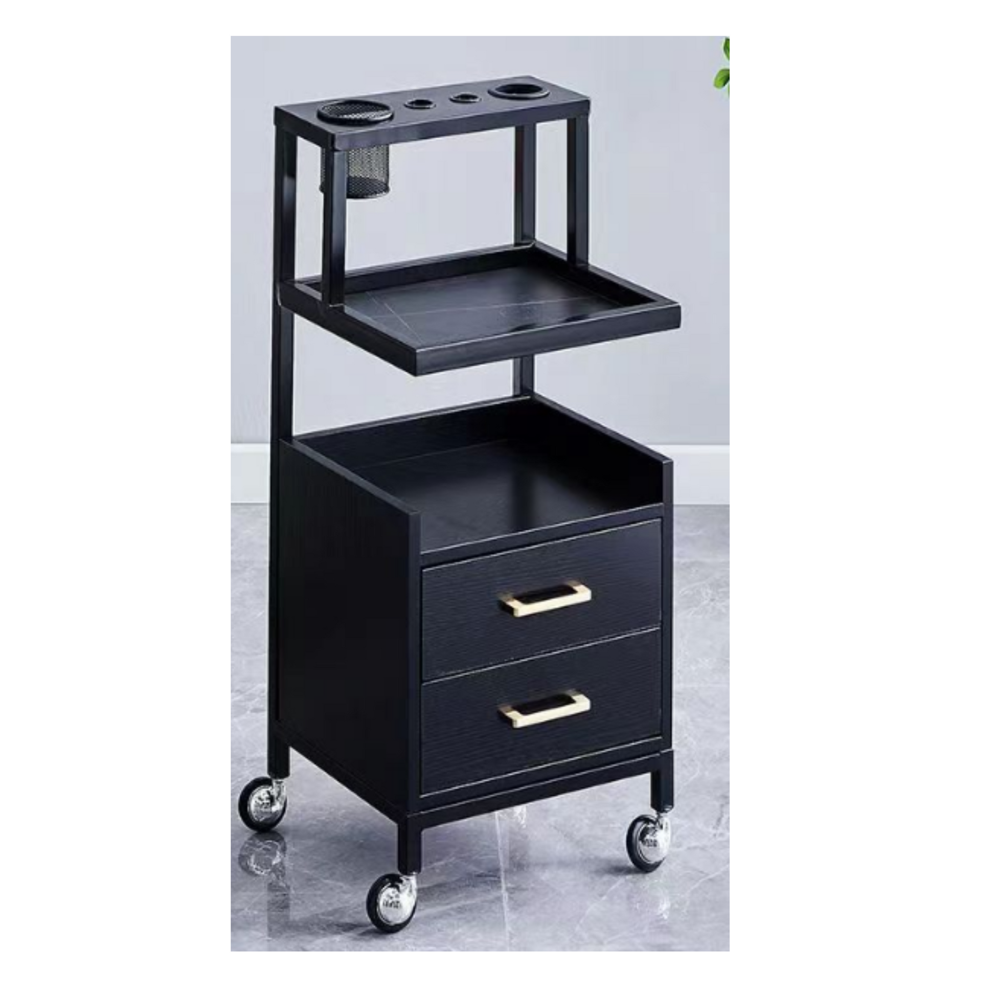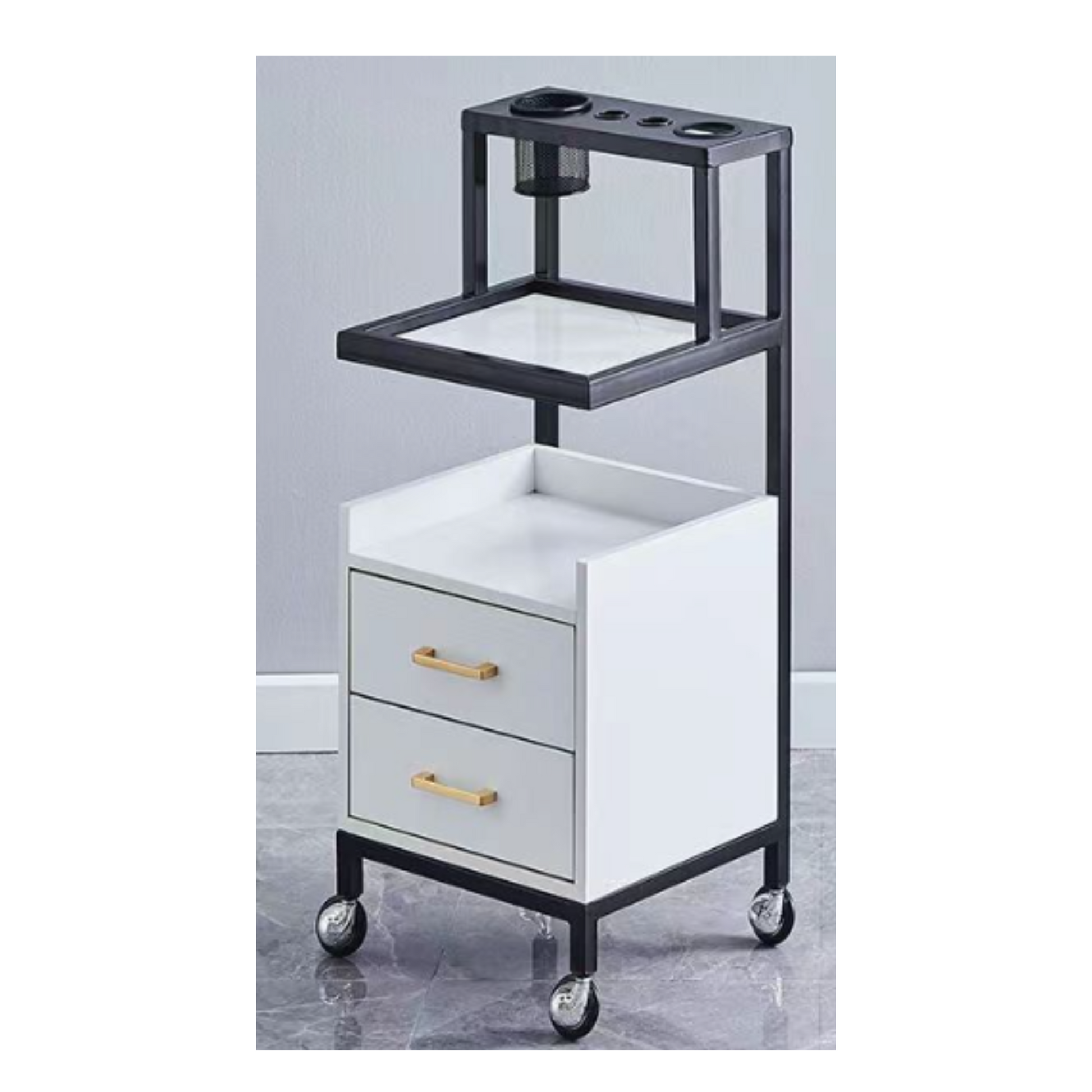 The Trent Portable Salon Trolley by Golden Devon (D-90041) features a sleek wooden body with two work tops, three tool holders, and two drawers - all mounted on smooth-rolling wheels for easy mobility in any salon space.